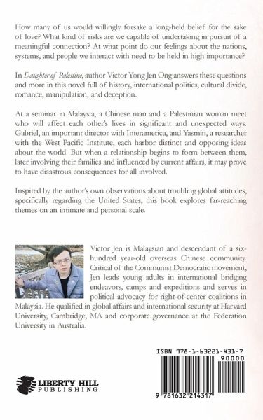 How many of us would willingly forsake a long-held belief for the sake of love? What kind of risks are we capable of undertaking in pursuit of a meaningful connection? At what point do our feelings about the nations, systems, and people we interact with need to be held in high importance? In Daughter of Palestine, author Victor Yong Jen Ong answers these questions and more in this novel full of history, international politics, cultural divide, romance, manipulation, and deception. At a seminar in Malaysia, a Chinese man and a Palestinian woman meet who will affect each other's lives in significant and unexpected ways. Gabriel, an important director with Interamerica, and Yasmin, a researcher with the West Pacific Institute, each harbor distinct and opposing ideas about the world. But when a relationship begins to form between them, later involving their families and influenced by current affairs, it may prove to have disastrous consequences for all involved. Inspired by the author's own observations about troubling global attitudes, specifically regarding the United States, this book explores far-reaching themes on an intimate and personal scale. Victor Jen is Malaysian and descendant of a six-hundred year-old overseas Chinese community. Critical of the Communist Democratic movement, Jen leads young adults in international bridging endeavors, camps and expeditions and serves in political advocacy for right-of-center coalitions in Malaysia. He qualified in global affairs and international security at Harvard University, Cambridge, MA and corporate governance at the Federation University in Australia.