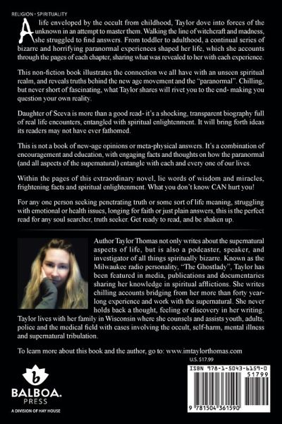 A life enveloped by the occult from childhood, Taylor dove into forces of the unknown in an attempt to master them. Walking the line of witchcraft and madness, she struggled to find answers. From toddler to adulthood, a continual series of bizarre and horrifying paranormal experiences shaped her life, which she accounts through the pages of each chapter, sharing what was revealed to her with each experience. This non-fiction book illustrates the connection we all have with an unseen spiritual realm, and reveals truths behind the new age movement and the "paranormal". Chilling, but never short of fascinating, what Taylor shares will rivet you to the end- making you question your own reality. Daughter of Sceva is more than a good read- it’s a shocking, transparent biography full of real life encounters, entangled with spiritual enlightenment. It will bring forth ideas its readers may not have ever fathomed. This is not a book of new-age opinions or meta-physical answers. It’s a combination of encouragement and education, with engaging facts and thoughts on how the paranormal (and all aspects of the supernatural) entangle with each and every one of our lives. Within the pages of this extraordinary novel, lie words of wisdom and miracles, frightening facts and spiritual enlightenment. What you don’t know CAN hurt you! For any one person seeking penetrating truth or some sort of life meaning, struggling with emotional or health issues, longing for faith or just plain answers, this is the perfect read for any soul searcher, truth seeker. Get ready to read, and be shaken up.
