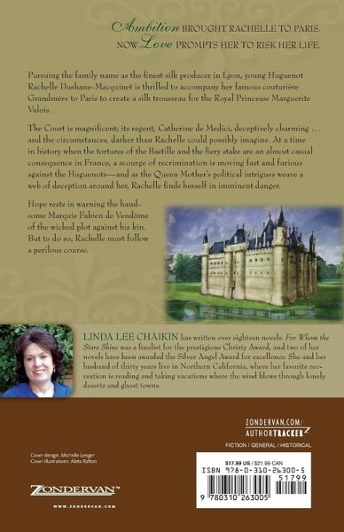 Pursuing the family name as the finest silk producer in Lyon, the young Huguenot Rachelle Dushane-Macquinet is thrilled to accompany her famous couturier Grandmere to Paris, there to create a silk trousseau for the Royal Princess Marguerite Valois.The Court is magnificent; its regent, Catherine de Medici, deceptively charming ... and the circumstances, darker than Rachelle could possibly imagine. At a time in history when the tortures of the Bastille and the fiery stake are an almost casual consequence in France, a scourge of recrimination is moving fast and furious against the Huguenots---and as the Queen Mother's political intrigues weave a web of deception around her, Rachelle finds herself in imminent danger.Hope rests in warning the handsome Marquis Fabien de Vendome of the wicked plot against his kin. But to do so, Rachelle must follow a perilous course.