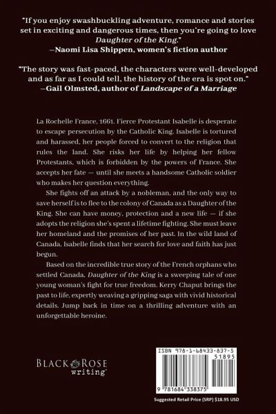 "Chaput beautifully conjures the haunting fate of the French Huguenots, and the indelible human drive to fight for love and freedom." -Allison Pataki, New York Times bestselling author of The Magnificent Lives of Marjorie Post 1661 France. Fierce Protestant Isabelle has lost everything at the hands of brutal nobles who thieve and persecute their way into the king's good graces. Shaken and desperate after a vicious attack, she accepts a deal as her only means of survival: become one of the king's honorary daughters. She can set sail to Canada to build the population in the struggling colony with a dowry from the king, protection, money, and power over her future. This opportunity also comes with sacrifice. Though Isabelle bleeds Protestantism, committed to a fight that lives deep in her bones, she must convert to the religion that killed her family and burned her flesh. In the wilds of Canada, a newly Catholic Isabelle grapples with the desire to reignite her quest, while a love triangle rife with secrets and betrayal forces her to decide who she really is-and if she's willing to risk her life once again in the name of freedom. Based on the incredible true story of the French orphans who settled French Canada, Daughter of the King is the sweeping tale of a heroine born of desperation. Kerry Chaput brings the past to life, expertly weaving a gripping saga with vivid historical details. Jump back in time on a thrilling adventure with this heart pounding trilogy.