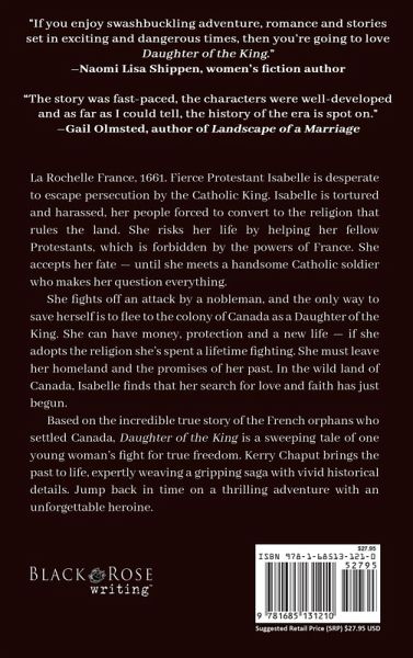 "Chaput beautifully conjures the haunting fate of the French Huguenots, and the indelible human drive to fight for love and freedom." -Allison Pataki, New York Times bestselling author of The Magnificent Lives of Marjorie Post 1661 France. Fierce Protestant Isabelle has lost everything at the hands of brutal nobles who thieve and persecute their way into the king's good graces. Shaken and desperate after a vicious attack, she accepts a deal as her only means of survival: become one of the king's honorary daughters. She can set sail to Canada to build the population in the struggling colony with a dowry from the king, protection, money, and power over her future. This opportunity also comes with sacrifice. Though Isabelle bleeds Protestantism, committed to a fight that lives deep in her bones, she must convert to the religion that killed her family and burned her flesh. In the wilds of Canada, a newly Catholic Isabelle grapples with the desire to reignite her quest, while a love triangle rife with secrets and betrayal forces her to decide who she really is-and if she's willing to risk her life once again in the name of freedom. Based on the incredible true story of the French orphans who settled French Canada, Daughter of the King is the sweeping tale of a heroine born of desperation. Kerry Chaput brings the past to life, expertly weaving a gripping saga with vivid historical details. Jump back in time on a thrilling adventure with this heart pounding trilogy.
