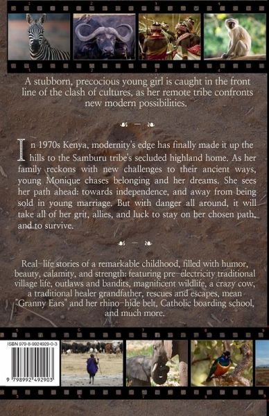 A stubborn, precocious young girl is caught in the front line of the clash of cultures, as her remote tribe confronts new modern possibilities. In 1970s Kenya, modernity's edge has finally made it up the hills to the Samburu tribe's secluded highland home. As her family reckons with new challenges to their ancient ways, young Monique chases belonging and her dreams. She sees her path ahead: towards independence, and away from being sold in young marriage. But with danger all around, it will take all of her grit, allies, and luck to stay on her chosen path, and to survive. Real-life stories of a remarkable childhood, filled with humor, beauty, calamity, and strength: featuring pre-electricity traditional village life, outlaws and bandits, magnificent wildlife, a crazy cow, a traditional healer grandfather, rescues and escapes, mean "Granny Ears" and her rhino-hide belt, Catholic boarding school, and much more. Ages 14+ : some mature themes, some cursing . . . . The Samburu, a group of the Maasai, live in Kenya's cool northwest highlands, near the Great Rift Valley. They take much pride in their traditions and ancient culture, which is rich in heritage and skill for surviving via the Old Ways. For centuries they have been quasi-nomadic pastoralists: herdsfolk who move around when it's useful to help their animals, traditionally cattle, thrive. Monique's childhood was at a unique cultural transition point, but the issues she struggled with still challenge many families. This is especially so for the most remote and poorest, and for women and girls, who often still face enormous misogyny, abuse, FGM, and forced marriage. Traditional society is rigidly organized, and strictly controls women and girls, seeing them as mainly supports-or commodities-for men, and for raising children and doing most of the village labor. Samburu girls have often faced great difficulty if, like Monique, they aspire to a different path. Modernity and climate change have placed additional strain on the already-difficult highland pastoralist life, causing rapid change. The ancient village-based cattle-keeping ways and the traditional medicine practiced by Monique's grandfather, for instance, may not last much longer. Her stories are also a useful record of some of those rapidly-vanishing ways, seen through her eyes; and a record of what it was like to live-as a girl-at the point when the hammer hit the anvil: when great change came for a culture that had long been seen as, and indeed regarded itself as, unchangeable. Her stories also raise several big questions:Do we have to follow what our culture has planned for us, just because it has long been upheld as excellent? What do we do when the multiple aspects of our identities-ethnic/tribal, national, religious, gender, human-place conflicting demands on us and our rights and desires? How do children who face great difficulty and lack of support survive? How much can they thrive without that full support? How do you face intolerable control, hostility, and prejudice and escape to build your own life? Names have been changed for privacy and dialogue and scenes reconstructed, but the story is told within the limits of standard memoir and creative nonfiction practice.