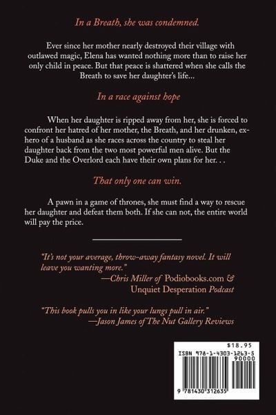 In a Breath, she was condemned. Ever since her mother nearly destroyed their village with outlawed magic, Elena has wanted nothing more than to raise her only child in peace. But that peace is shattered when she calls the Breath to save her daughter's life... To a race against hope. When her daughter is ripped away from her, she is forced to confront her hatred of her mother, the Breath, and her drunken, ex-hero of a husband as she races across the country to steal her daughter back from the two most powerful men alive. But the Duke and the Overlord each have their own plans for her... That only one can win. A pawn in a game of thrones, she must find a way to rescue her daughter and defeat them both. If she can not, the entire world will pay the price. Listen to reviews and learn more at: LonnieEzell.com
