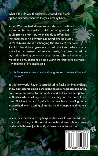 What if the life you thought you wanted came with tighter manacles than the life you already have? Raven Wynters had always known she was meant for more than this dying world had to give her. But when the duke offers her the position as his Favored Diamond, she hesitates. She's skeptical about swapping the chains of her hard life for the duke's gem encrusted shackles. When she is forced into an answer before she's ready, Emric-a man with a mysterious background-rescues her and whisks her away to a world she only thought existed within her mother's fairytales. A world full of life and magic. But is this new adventure simply another set of chains? In this new world, Raven is astonished to discover a family she didn't know existed and a magic she didn't realize she possessed. She's even more surprised to find a dark and hot as hell companion in Basilius who challenges her to see beyond the end of her nose. But her trust and loyalty in the people surrounding her is jeopardized when a string of murders and kidnappings threatens her life. Raven must question everything she has ever known and decide where she belongs in the world before her choice is taken away, or she will learn just how tight those manacles can be.