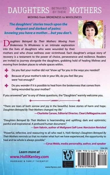 The daughters' stories touch upon the deepest and darkest of pains: knowing you have a mother... but you don't. Daughters Betrayed By Their Mothers: Moving From Brokenness To Wholeness is an intimate exploration into the lives of daughters who were wounded by their mothers and who chose wellness over victimhood. Each daughter's unique story of recovery is a testament to the power of choice, perseverance and resilience. Readers are invited to journey alongside the daughters, grabbing hold of healing lifelines and moving from broken places to whole spaces within. Do you feel your mother did not "show up" for you in the ways you needed? Because of your mother's role in your life, do you feel like you were "not enough?" Do you wonder if it is possible to heal from the brokenness that comes from being wounded by your mother? If you answered "yes" to any of these questions, the "Daughters" warmly welcome you. "There are tears of both sorrow and joy in the beautiful, brave stories of harm and hope. Daughters Betrayed By Their Mothers changed my life." --Charlotte Carson, Editorial Director, ClearLifeMagazine.com "Daughters Betrayed By Their Mothers is heartrending and uplifting; dark and optimistic; painful and inspirational. A profound human document." --Sam Vaknin, author of Malignant Self-Love: Narcissism Revisited "Powerful, reflective, and reassuring to all who read it, Holli Kenley's Daughters Betrayed By Their Mothers reminds us that no matter what hurt we have experienced, the opportunity to heal and be whole is always possible." --Cyrus Webb, media personality, author, and speaker Learn more at www.HolliKenley.com From Loving Healing Press www.LHPress.com