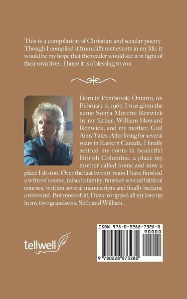 Born in Pembrook, Ontario, on February 11, 1967, I was given the name Sonya Morette Renwick by my father, William Howard Renwick, and my mother, Gail Aimy Yates. After living for several years in Eastern Canada, I finally settled my roots in beautiful British Columbia, a place my mother called home and now a place I do too. Over the last twenty years I have finished a writers' course, raised a family, finished several biblical courses, written several manuscripts and finally became a reverend. But most of all, I have wrapped all my love up in my two grandsons, Seth and William.