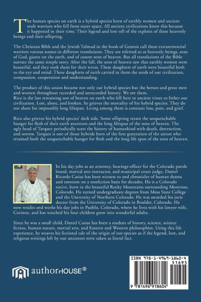 The human species on earth is a hybrid species born of earthly women and ancient male warriors who fell from outer space. All ancient civilizations knew this because it happened in their time. Their legend and lore tell of the exploits of these heavenly beings and their offspring. The Christian Bible and the Jewish Talmud in the book of Genesis call these extraterrestrial warriors various names in different translations. They are referred to as heavenly beings, sons of God, giants on the earth, and of course sons of heaven. But all translations of the Bible narrate the same simple story. After the fall, the sons of heaven saw that earthly women were beautiful, and they took them for their wives. These daughters of earth were beautiful both to the eye and mind. These daughters of earth carried in them the seeds of our civilization, compassion, cooperation and understanding. The product of this union became not only our hybrid species but the heroes and great men and women throughout recorded and unrecorded history. We are them. Rico is the last remaining son of heaven on earth who fell here in ancient times to father our civilization. Lost, alone, and broken, he grieves the mortality of his hybrid species. They do not share his impossibly long lifespan. Living among them is constant loss, pain, and grief. Rico also grieves his hybrid species? dark side. Some offspring retain the unquenchable hunger for flesh of their earth ancestors and the long lifespan of the sons of heaven. The ugly head of Tarquez periodically scars the history of humankind with death, destruction, and sorrow. Tarquez is one of those hybrids born of the first generation of the union who retained both the unquenchable hunger for flesh and the long life span of the sons of heaven.