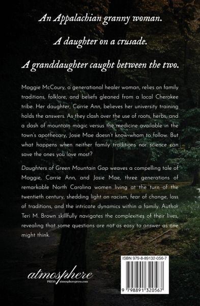 WINNER of the 2024 Shelf Unbound Best Indie Book An Appalachian granny woman. A daughter on a crusade. A granddaughter caught between the two. Maggie McCoury, a generational healer woman, relies on family traditions, folklore, and beliefs gleaned from a local Cherokee tribe. Her daughter, Carrie Ann, believes her university training holds the answers. As they clash over the use of roots, herbs, and a dash of mountain magic versus the medicine available in the town's apothecary, Josie Mae doesn't know whom to follow. But what happens when neither family traditions nor science can save the ones you love most? Daughters of Green Mountain Gap weaves a compelling tale of Maggie, Carrie Ann, and Josie Mae, three generations of remarkable North Carolina women living at the turn of the twentieth century, shedding light on racism, fear of change, loss of traditions, and the intricate dynamics within a family. Author Teri M. Brown skillfully navigates the complexities of their lives, revealing that some questions are not as easy to answer as one might think. Also the winner of the following Awards: 2025 Reader Views Literary Awards - Gold - Historical Fiction The Tyler R. Tichelaar Award for Best Historical Fiction Global Spines Book Award Winner 2024 Readers Favorite Award - Gold in Historical Fiction 2025 Feathered Quill Book Awards - Gold - Women's Fiction 2024 BREW Fiction Book Excellence Award - Historical Fiction of the Year Royal Dragonfly Book Awards - 1st Place - Historical Fiction International Firebird Book Award - First Place Women's Fiction 2024 Readers Favorite Award - Gold in Historical Fiction 2024 BookFest Awards - First Place Historical Fiction NABE Pinnacle Book Achievement Award - Best Books in Historical Fiction The Difference Maker Badge 2024 HFC Book of the Year - Hawthorne US - Silver Award Literary Global Book Awards - Historical Fiction Finalist 2024 Author Shout Reader Ready Awards - Top Pick Autumn 2024 Readers' Choice Book Awards - Silver Best Adult Book 2024 American Writing Awards - Historical Fiction Finalist 2024 American Fiction Awards - Historical Fiction Finalist 2024 International Impact Book Awards Winner 2024 Zibby Awards - Best Book for the History Lover ¿¿¿¿¿¿¿Book Excellence Award Winner - Historical Fiction 2025 Incipere Awards - First Place Women's Fiction & First Place Place Historical Fiction 2025 Maxy Awards for Historical Fiction - Finalist