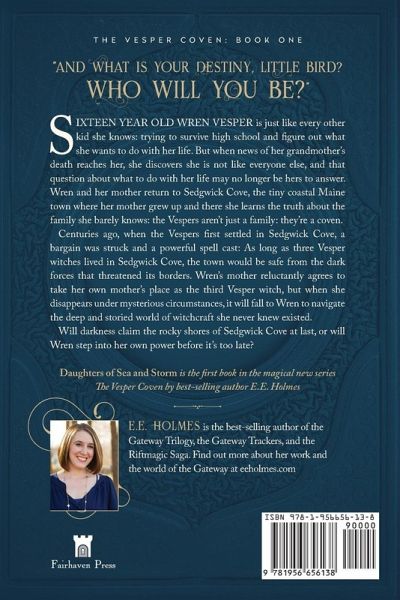 "And what is your destiny, Little Bird? Who will you be?" Sixteen-year-old Wren Vesper is just like every other kid she knows: trying to survive high school and figure out what she wants to do with her life. But when news of her grandmother's death reaches her, she discovers she is not like everyone else, and that question about what to do with her life may no longer be hers to answer. Wren and her mother return to Sedgwick Cove, the tiny coastal Maine town where her mother grew up, and there she learns the truth about the family she barely knows: the Vespers aren't just a family: they're a coven. Centuries ago, a bargain was struck and a powerful spell cast: As long as three Vesper witches lived in Sedgwick Cove, the town would be safe from the dark forces that threatened its borders. Wren's mother reluctantly agrees to take her own mother's place as the third Vesper witch, but when she disappears under mysterious circumstances, it falls to Wren to navigate the dark and winding world of witchcraft she never knew existed. Can Wren step into her own power before it's too late? Daughters of Sea and Storm: The Vesper Coven Book 1, is the first in a thrilling new series set in the World of the Gateway by E.E. Holmes.