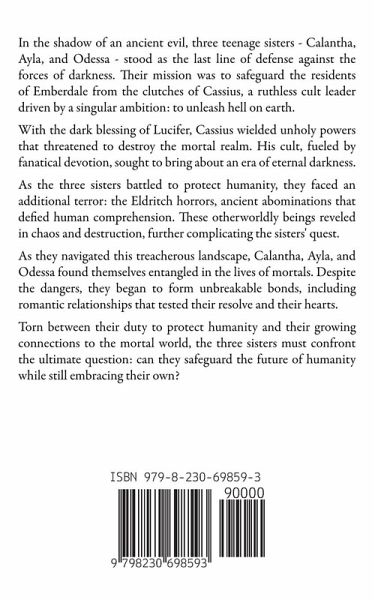 In the shadow of an ancient evil, three teenage sisters - Calantha, Ayla, and Odessa - stood as the last line of defense against the forces of darkness. Their mission was to safeguard the residents of Emberdale from the clutches of Cassius, a ruthless cult leader driven by a singular ambition: to unleash hell on earth. With the dark blessing of Lucifer, Cassius wielded unholy powers that threatened to destroy the mortal realm. His cult, fueled by fanatical devotion, sought to bring about an era of eternal darkness. As the three sisters battled to protect humanity, they faced an additional terror: the Eldritch horrors, ancient abominations that defied human comprehension. These otherworldly beings reveled in chaos and destruction, further complicating the sisters' quest. As they navigated this treacherous landscape, Calantha, Ayla, and Odessa found themselves entangled in the lives of mortals. Despite the dangers, they began to form unbreakable bonds, including romantic relationships that tested their resolve and their hearts. Torn between their duty to protect humanity and their growing connections to the mortal world, the three sisters must confront the ultimate question: can they safeguard the future of humanity while still embracing their own?