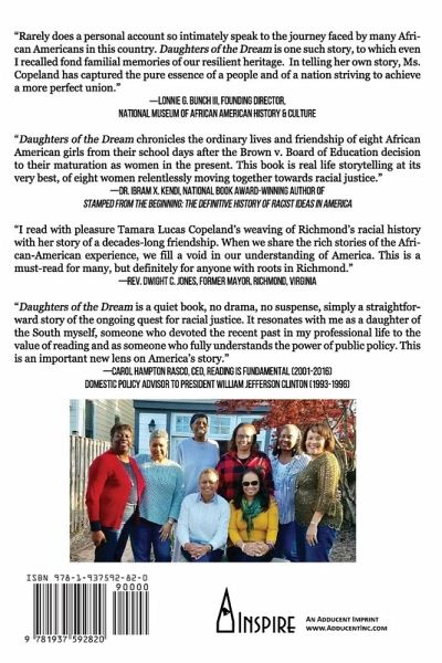 Understanding race in America-its history of oppression, inequality, inequity, prejudice, and discrimination-has been a journey for many, even for me, a black person who has lived through it. Journeys begin with a want or need to move from one place to another. Sometimes they're geographic, but often they are an existential expedition to comprehend how something came to be and the impact it has on self, family or community. This book is about my growing understanding of what I and my friends experienced. And my reflection on how those events not only molded us as adults, but shaped, and continue to shape our country. It also explores the little-examined role that everyday people play in creating extraordinary movements for social justice. Given the title of this book, you may have a preconceived idea of what it's about. I grew up in the 1950s and '60s in Richmond, Virginia-not just any Southern city, the capital of the Confederacy, a city still with significant vestiges of that heritage-so, you might expect stories of mistreatment based on race. But that is only this book's backdrop, not its core. The story is about family, friends, cocoons of love, support and pushing beyond the constraints of boundaries. It was in college my friends and I became black. Black in the sense of a heightened awareness of racial identity. No longer a brown reflection of whites but understanding what it meant to be black. It had started in high school, but these thoughts, these realizations, matured in college as we thought about our past. Immersed all our lives in the history and heritage of European whites, we knew little of our own history, our contributions and nothing of African history. Our issues had become more nuanced as some protested racism and advocated for equality. Just as it should, college expanded our minds and Richmond and our families were no longer at the center of our thinking. Our upbringing would forever be fundamental to who we were, but not the sole determinant of who we became. Exposure to the experiences and thoughts of others from all over the country and around the world now factored into our understanding of many issues and helped to form how we viewed the world and the events of the day. History shaped us as much as our families did. So too did our friendships. And unlike the overarching effect of history or the subliminal and expected influence of family, our friendship with its extraordinary, ongoing implications has connected us to a past and provided a resonant sounding board for examining our present. Human nature desires friendships formed from shared experience, values, laughter and a few tears. It creates simple bonds, the best kind. We are family. We are the daughters of the dream. -Tamara Lucas Copeland