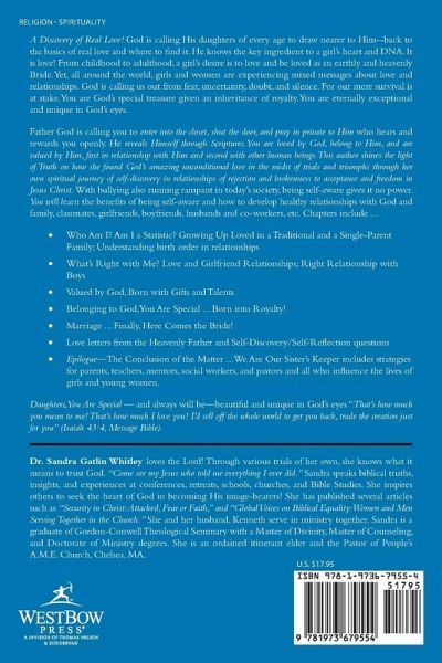 God loves and values the women He has created. Each one of His special daughters belongs to Him and is eternally exceptional and unique in His eyes. A Discovery of Real Love! In an inspired guidebook, ordained minister Sandra Gatlin Whitley invites girls and women to embark on a beautiful journey to discover who they are, who they belong to, who loves them, and ultimately how to enjoy healthy relationships with God and others. While learning how to apply their identity, worth, and values as His image-bearer, girls and teens will also gather an understanding as to who they are according to the God's purpose for them. You are God's special treasure given an inheritance of royalty. An included epilogue provides action strategies for parents, teachers, mentors, and all those who influence the lives of young women. Daughters, You Are Special shares advice and encouragement that guides Christian girls and young women to discover their true identity, worth, and value in the scriptures while remembering that they are-and always will be-beautiful and unique in God's eyes. "That's how much you mean to me! That's how much I love you! I'd sell off the whole world to get you back, trade the creation just for you" (Isaiah 43:4, MSG).