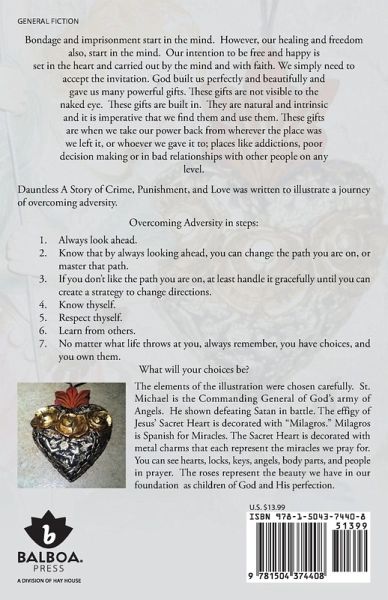 Bondage and imprisonment start in the mind. However, our healing and freedom also, start in the mind. Our intention to be free and happy is set in the heart and carried out by the mind and with faith. We simply need to accept the invitation. God built us perfectly and beautifully and gave us many powerful gifts. These gifts are not visible to the naked eye. These gifts are built in. They are natural and intrinsic and it is imperative that we find them and use them. These gifts are when we take our power back from wherever the place was we left it, or whoever we gave it to; places like addictions, poor decision making or in bad relationships with other people on any level. Dauntless A Story of Crime, Punishment, and Love was written to illustrate a journey of overcoming adversity.