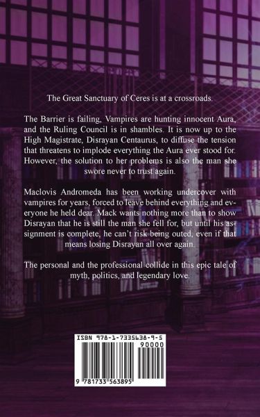 The Great Sanctuary of Ceres is at a crossroads. The barrier is failing, vampires are hunting innocent Aura, and the Ruling Council is in shambles. It is now up to the High Magistrate, Disrayan Centaurus, to diffuse the tension that threatens to implode everything the Aura ever stood for. However, the solution to her problems is also the man she swore never to trust again. Maclovis Andromeda has been working undercover with vampires for years, forced to leave behind everything and everyone he held dear. Mack wants nothing more than to show Disrayan that he is still the man she fell for, but until his assignment is complete, he can't risk being outed, even if that means losing Disrayan all over again. The personal and the professional collide in this epic tale of myth, politics, and legendary love.