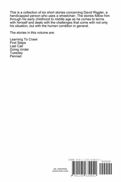 This is a collection of six short stories concerning David Riggler, a handicapped person who uses a wheelchair. The stories follow him through his early childhood to middle age as he comes to terms with himself and deals with the challenges that come with not only his situation, but with the human condition in general. The stories in this volume are: Learning To Crawl First Steps Last Call Going Under Tuesday Penned