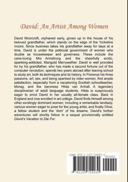 The novel recounts the adventures of David, orphaned grandson of a wealthy Yorkshire businessman, as he grows from a teenager brought up and disciplined by a succession of governesses, and moves out into the world of painting and drawing. While visiting the art centers of Europe, the young artist is involved with several fascinating and attractive women in Florence. In turn they become sexually interested in David and several of them seem to enjoy spanking him. This is not really surprising because David is a natural 'bottom' and he tends to attract women who are natural 'tops'. He thoroughly enjoys their attentions and submitting to their dominant behavior. Back in England his adventures among maturer women, including models and a fellow student, continue at university, Along the way he discovers that women who enjoy spanking men are just as likely to enjoy spanking other women too. What he witnesses as much as what he experiences gives him a rich education in art, women, sex - and spanking!