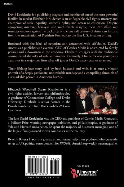 David Kruidenier is a publishing magnate and member of one of the most powerful families in media; Elizabeth Kruidenier is an unflappable civil rights attorney and champion of racial equality, women's rights, and access to education. Despite competing interests, betrayal, and unthinkable tragedy, their love affair and marriage endures against the backdrop of the last half century of American history, from the assassination of President Kennedy to the first U.S. invasion of Iraq. Burdened with the label of nepotism and consumed with self-doubt, David's success as a publisher and eventual CEO of Cowles Media is obstructed by family politics and a downturn in the economy. Elizabeth struggles with the traditional constraints of the roles of wife and mother. Eventually, Elizabeth's new position as a partner in a major law firm takes off just as David's career crashes to an end. Their lifelong love story, told by both husband and wife, is at once a vibrant portrait of a deeply passionate, unbreakable marriage and a compelling chronicle of a remarkable period in American history.