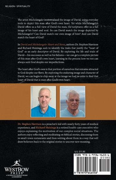 The artist Michelangelo immortalized the image of David, using everyday tools to depict this man after God's own heart. Yet while Michelangelo's David offers us a full view of David the man, the scriptures offer us a full image of his heart and soul. So can David match the image depicted by Michelangelo? Can David match our own image of him? And can David match the heart of God? In David and Michelangelo: Heart and Stone, authors Dr. Stephen Harrison and Richard Huizinga seek to identify the traits that justify the "heart of God" as an early descriptor of David. By exploring the life and trials of David-his successes as well as his failures-we can get a complete picture of this man after God's own heart, learning in the process how we too can always seek God despite our imperfections. The heart after God's own is that portion of ourselves that remains attracted to God despite our flaws. By exploring the enduring image and character of David, we can begin to chip away at the image we had in order to find that heart of David that is man after God's own heart.