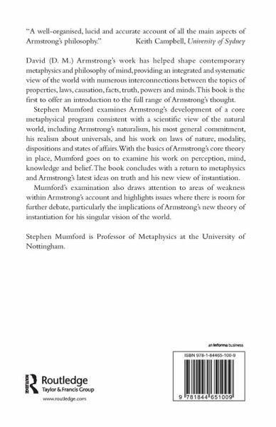 David Armstrong is one of Australia's greatest philosophers. His chief philosophical achievement has been the development of a core metaphysical programme, embracing the topics of universals, laws, modality and facts. This book offers an introduction to the full range of Armstrong's thought. It begins with a discussion of Armstong's naturalism.