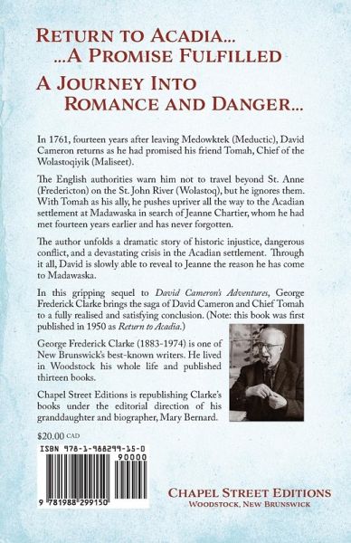 In 1761, fourteen years after leaving Medowktek (Meductic), David Cameron returns as he had promised his friend Tomah, Chief of the Wolastoqiyik (Maliseet). The English authorities warn him not to travel beyond St. Anne (Fredericton) on the St. John River (Wolastoq), but he ignores them. With Tomah as his ally, he pushes upriver all the way to the Acadian settlement at Madawaska in search of Jeanne Chartier, whom he had met fourteen years earlier and has never forgotten. The author unfolds a dramatic story of historic injustice, dangerous conflict, and a devastating crisis in the Acadian settlement. Through it all, David is slowly able to reveal to Jeanne the reason he has come to Madawaska. In this gripping sequel to David Cameron’s Adventures, George Frederick Clarke brings the saga of David Cameron and Chief Tomah to a fully realised and satisfying conclusion. (Note: this book was first published in 1950 as Return to Acadia.) George Frederick Clarke (1883-1974) is one of New Brunswick’s best-known writers. He lived in Woodstock his whole life and published thirteen books. Chapel Street Editions is republishing Clarke’s books under the editorial direction of his granddaughter and biographer, Mary Bernard.