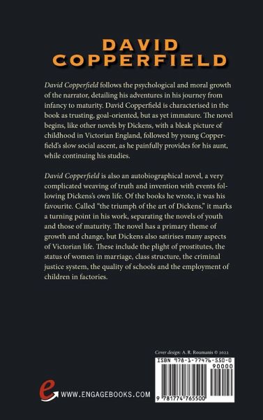 David Copperfield follows the psychological and moral growth of the narrator, detailing his adventures in his journey from infancy to maturity. David Copperfield is characterised in the book as trusting, goal-oriented, but as yet immature. The novel begins, like other novels by Dickens, with a bleak picture of childhood in Victorian England, followed by young Copperfield's slow social ascent, as he painfully provides for his aunt, while continuing his studies. David Copperfield is also an autobiographical novel, a very complicated weaving of truth and invention with events following Dickens's…mehr