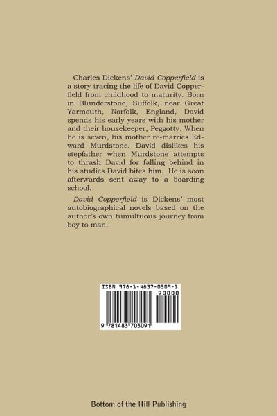 Charles Dickens' David Copperfield is a story tracing the life of David Copperfield from childhood to maturity. Born in Blunderstone, Suffolk, near Great Yarmouth, Norfolk, England, David spends his early years with his mother and their housekeeper, Peggotty. When he is seven, his mother re-marries Edward Murdstone. David dislikes his stepfather when Murdstone attempts to thrash David for falling behind in his studies David bites him. He is soon afterwards sent away to a boarding school. David Copperfield is Dickens' most autobiographical novels based on the author's own tumultuous journey from boy to man.…mehr