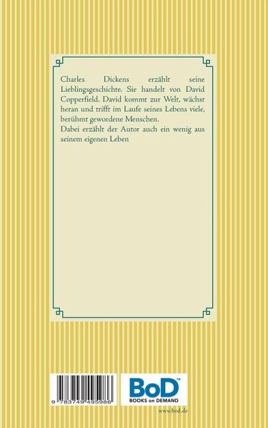 Charles Dickens erzählt seine Lieblingsgeschichte. Sie handelt von David Copperfield. David kommt zur Welt, wächst heran und trifft im Laufe seines Lebens viel, zwischenzeitlich berühmt gewordene Menschen. Dabei erzählt der Autor auch ein wenig aus seinem eigenen Leben.