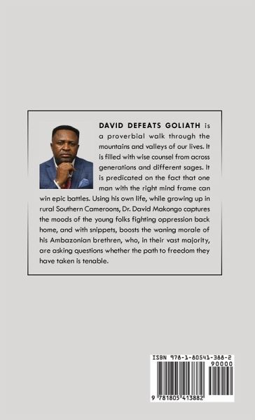 DAVID DEFEATS GOLIATH is a proverbial walk down the mountains and valleys of our lives. It is filled with wise counsel from across generations and different sages. It is predicated on the fact that one man with the right mind frame can win epic battles. Using his own life, while growing up in rural Southern Cameroons, Dr. David Makongo captures the moods of the young folks fighting oppression back home, and with snippets, boosts the waning morale of his Ambazonian brethren, who in their vast majority are asking questions whether the path to freedom they took is tenable.