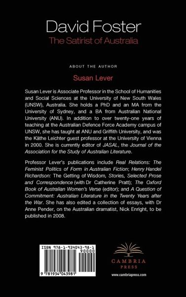 David Foster is the most original, challenging, contradictory, risk-taking and infuriating Australian novelist of his generation. To date he has published twelve novels, three collections of novellas and short stories, two books of poetry, and a collection of essays, with several produced radio plays. Foster writes in an Australian tradition of idiosyncratic satire and comedy that may be traced through the work of Joseph Furphy, Miles Franklin, Xavier Herbert and David Ireland. His novels are the most wide-ranging and fearless of the Australian novels that have contributed to the late twentieth-century re-examination of Western ideologies and the literary forms in which they are expressed. In this first critical study of David Foster's works, Professor Susan Lever steers us into penetrating the mysteries of Foster's fiction, and provides guidance to readers willing to approach them. The book examines the contradictory nature of his commitments and interests as expressed mainly in his novels. Each of his works of fiction and poetry in the order of publication (except for The Adventures of Christian Rosy Cross and The Pale Blue Crochet Coathanger Cover which are discussed with similar novels) are discussed. The development of Foster's philosophical ideas and technique as a novelist over the 35 years of his writing life to date is followed. The book also examines Foster's letters to Geoffrey Dutton early in his career; his interviews and essays provide some of the background to these novels. The book also furnishes a sense of the Australian context for his work. A brief biography of Foster's early life and a discussion of his approach to satire is also included.