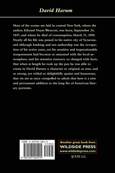 Most of the scenes are laid in central New York, where the author, Edward Noyes Westcott, was born, September 24, 1847, and where he died of consumption, March 31, 1898. Nearly all his life was passed in his native city of Syracuse, and although banking and not authorship was the occupation of his active years, yet his sensitive and impressionable temperament had become so saturated with the local atmosphere, and his retentive memory so charged with facts, that when at length he took up the pen he was able to create in David Harum a character so original, so true, and so strong, yet withal so delightfully quaint and humorous, that we are at once compelled to admit that here is a new and permanent addition to the long list of American literary portraits.
