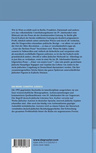 Wie in Wien so erlebt auch in Berlin, Frankfurt, Darmstadt und andernorts das volkstümliche Unterhaltungstheater im 19. Jahrhundert eine Blütezeit mit der Posse als der dominierenden Gattung. In Berlin gibt David Kalisch der bereits etablierten Gattung ein deutlich prägnanteres Profil, nämlich mittels seines satirischen Witzes und durch oft verdeckte, aber für Eingeweihte erkennbare politische Bezüge - vor allem vor und in der Zeit der März-Revolution -, so dass er verschiedentlich sogar als "Vater der Berliner Posse" bezeichnet wird. Wenn bis dahin Juden zumeist in Nebenrollen und vielfach als lächerliche und verspottete oder als moralisch zweifelhafte Figuren auftreten, so ist das bei Kalisch nicht grundsätzlich anders, obwohl er selbst jüdischer Herkunft ist. Allerdings ist es just ihm zu verdanken, wenn in einer bis ins 20. Jahrhundert hinein erfolgreichen Posse - "Einer von unsere Leut'"- eine rein positiv gezeichnete jüdische Hauptfigur begegnet und Aspekte des Lebens von Juden in der nicht-jüdischen Umgebung in Deutschland thematisiert werden. Die hier zusammengestellten Stücke bieten das ganze Spektrum unterschiedlicher jüdischer Figuren in Kalischs Stücken.