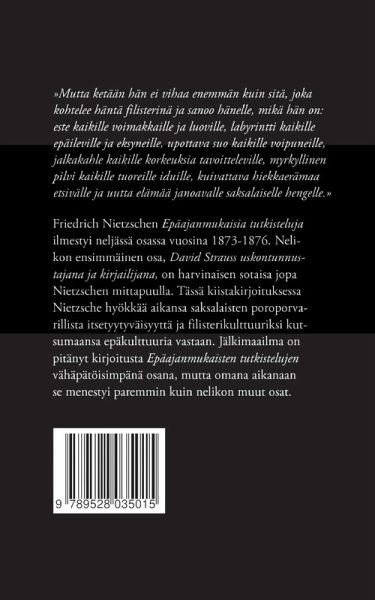 Friedrich Nietzschen Epäajanmukaisia tutkisteluja ilmestyi neljässä osassa vuosina 1873-1876. Nelikon ensimmäinen osa, David Strauss uskontunnustajana ja kirjailijana, on harvinaisen sotaisa jopa Nietzschen mittapuulla. Tässä kiistakirjoituksessa Nietzsche hyökkää aikansa saksalaisten poroporvarillista itsetyytyväisyyttä ja filisterikulttuuriksi kutsumaansa epäkulttuuria vastaan. Jälkimaailma on pitänyt kirjoitusta Epäajanmukaisten tutkistelujen vähäpätöisimpänä osana, mutta omana aikanaan se menestyi paremmin kuin nelikon muut osat.