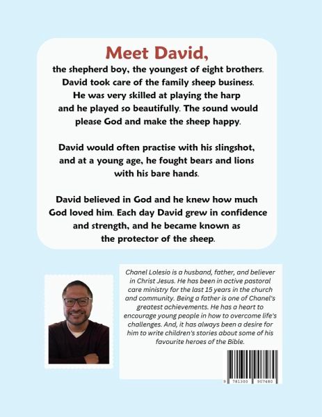 Meet David, the shepherd boy, the youngest of eight brothers. David took care of the family sheep business. He was very skilled at playing the harp and he played so beautifully. The sound would please God and make the sheep happy. David would often practise with his slingshot, and at a young age, he fought bears and lions with his bare hands. David believed in God and he knew how much God loved him. Each day David grew in confidence and strength, and he became known as the protector of the sheep. This book would make a wonderful read-aloud or gift and is perfect for children ages 3-12.