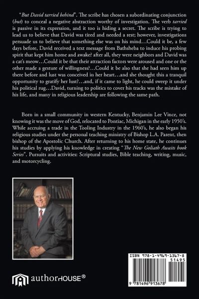 "But David tarried behind". The scribe has chosen a subordinating conjunction (but) to conceal a negative abstraction worthy of investigation. The verb tarried is passive in its expression, and it too is hiding a secret. The scribe is trying to lead us to believe that David was tired and needed a rest; however, investigations persuade us to believe that something else was on his mind...Could it be, a few days before, David received a text message from Bathsheba to induce his probing spirit that kept him home and awake? after all, they were neighbors and David was a cat's meow...Could it be that their attraction factors were aroused and one or the other made a gesture of willingness?...Could it be also that she had seen him up there before and lust was conceived in her heart...and she thought this a tranquil opportunity to gratify her lust?...and, if it came to light, he could sweep it under his political rug...David, turning to politics to cover his tracks was the mistake of his life, and many in religious leadership are following the same path.