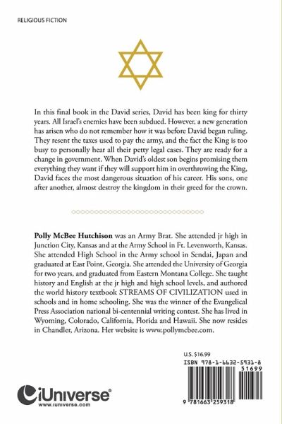In this final book in the David series, David has been king for thirty years. All Israel's enemies have been subdued. However, a new generation has arisen who do not remember how it was before David began ruling. They resent the taxes used to pay the army, and the fact the King is too busy to personally hear all their petty legal cases. They are ready for a change in government. When David's oldest son begins promising them everything they want if they will support him in overthrowing the King, David faces the most dangerous situation of his career. His sons, one after another, almost destroy the kingdom in their greed for the crown.