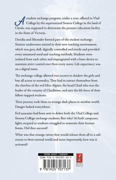 Astudent exchange program, under a ruse, offered to Vlad College by the supernatural Senora College in the land of Cluids, was supposed to determine the premier education facility in the State of Victoria. Davidia and Slirander formed part of the student exchange. Sinister undertones existed in their new teaching environment, which was grey, dull, digitally controlled and sterile and provided every unnatural need and teaching methods. Students were isolated from each other and impregnated with a knee device to maintain strict control over their every move. Life expectancy was on a digital timer. The exchange college allotted two escorts to shadow the girls and ban all access to normalcy. They had to extract themselves from the clutches of the evil Miss Alpine, the head Cluid who was the leader of the country of Cluidinine, and save the life force of their fellow trapped students. Their journey took them to strange dark places in another world. Danger lurked everywhere. Evil assassins had been sent to delete both the Vlad College and Senora College exchange students. But why? At both campuses, fights erupted as students struggled to maintain their human forms. Did they succeed? What was that strange tattoo that would release them all to a safe return to their normal world and more importantly, how was it activated?