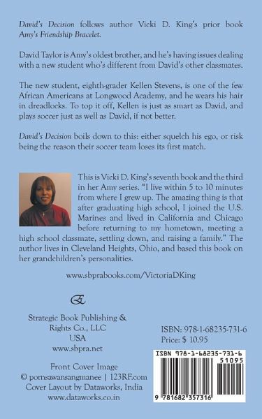 David's Decision follows author Vicki D. King's prior book Amy's Friendship Bracelet. David Taylor is Amy's oldest brother, and he's having issues dealing with a new student who's different from David's other classmates. The new student, eighth-grader Kellen Stevens, is one of the few African Americans at Longwood Academy, and he wears his hair in dreadlocks. To top it off, Kellen is just as smart as David, and plays soccer just as well as David, if not better. David's Decision boils down to this: either squelch his ego, or risk being the reason their soccer team loses its first match. Author Bio : This is Vicki D. King's seventh book and the third in her Amy series. "I live within 5 to 10 minutes from where I grew up. The amazing thing is that after graduating high school, I joined the U.S. Marines and lived in California and Chicago before returning to my hometown, meeting a high school classmate, settling down, and raising a family." The author lives in Cleveland Heights, Ohio, and based this book on her grandchildren's personalities.
