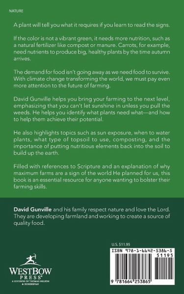 A plant will tell you what it requires if you learn to read the signs. If the color is not a vibrant green, it needs more nutrition, such as a natural fertilizer like compost or manure. Carrots, for example, need nutrients to produce big, healthy plants by the time autumn arrives. The demand for food isn't going away as we need food to survive. With climate change transforming the world, we must pay even more attention to the future of farming. David Gunville helps you bring your farming to the next level, emphasizing that you can't let sunshine in unless you pull the weeds. He helps you identify what plants need what-and how to help them achieve their potential. He also highlights topics such as sun exposure, when to water plants, what type of topsoil to use, composting, and the importance of putting nutritious elements back into the soil to build up the earth. Filled with references to Scripture and an explanation of why maximum farms are a sign of the world He planned for us, this book is an essential resource for anyone wanting to bolster their farming skills.