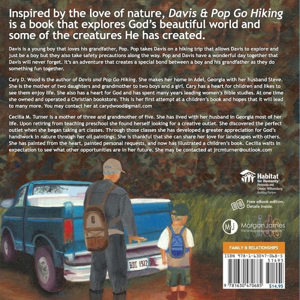 Inspired by the love of nature, Davis and Pop Go Hiking is a book that explores God's beautiful world and some of the creatures He has created. Davis is a young boy that loves his grandfather, Pop. Pop takes Davis on a hiking adventure that allows Davis to explore and just be a boy. Pop and Davis have a wonderful day together that Davis will never forget.