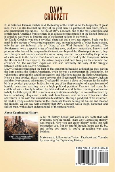 If you want to discover the captivating history of Davy Crockett, then keep reading... If, as historian Thomas Carlyle said, the history of the world is but the biography of great men, then it is also true that the story of the great men is a parable of their times, places, and generational aspirations. The life of Davy Crockett, one of the most cherished and remembered American frontiersmen, is an accurate representation of the United States as it stretched westward to become one of the largest nations in the world. Yet David Crockett was not a mythical character but a very real person. Such was his mark in the process of westward expansion that, among hundreds of other frontiersmen, only he got the informal title of "King of the Wild Frontier" for posterity. What is undeniable is that Davy Crockett was always faithful to his convictions, as he was guided by a deep commitment to justice, and above all, he was someone who always did what he thought was right, even running to aid his strongest political enemy, President Andrew Jackson, when someone tried to assassinate him. And that philosophy of life-doing the right thing no matter what-is much more than can be said of many others of his generation. In Davy Crockett: A Captivating Guide to the American Folk Hero Who Fought in the War of 1812 and the Texas Revolution, you will discover topics such asThe Frontiersman The Militiaman The Congressman The Celebrity Gone to Texas: The Freedom Fighter The Myth And much, much more! So if you want to learn more about Davy Crockett, scroll up and click the "add to cart" button!