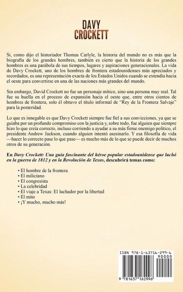 Si desea descubrir la fascinante historia de Davy Crockett siga leyendo... Si, como dijo el historiador Thomas Carlyle, la historia del mundo no es más que la biografía de los grandes hombres, también es cierto que la historia de los grandes hombres es una parábola de sus tiempos, lugares y aspiraciones generacionales. La vida de Davy Crockett, uno de los hombres de frontera estadounidenses más apreciados y recordados, es una representación exacta de los Estados Unidos cuando se extendía hacia el oeste para convertirse en una de las naciones más grandes del mundo. Sin embargo, David Crockett no fue un personaje mítico, sino una persona muy real. Tal fue su huella en el proceso de expansión hacia el oeste que, entre otros cientos de hombres de frontera, solo él obtuvo el título informal de "Rey de la Frontera Salvaje" para la posteridad. Lo que es innegable es que Davy Crockett siempre fue fiel a sus convicciones, ya que se guiaba por un profundo compromiso con la justicia y, sobre todo, fue alguien que siempre hizo lo que creía correcto, incluso corriendo a ayudar a su más firme enemigo político, el presidente Andrew Jackson, cuando alguien intentó asesinarlo. Y esa filosofía de vida -hacer lo correcto pase lo que pase- es mucho más de lo que se puede decir de muchos otros de su generación. En Davy Crockett: Una guía fascinante del héroe popular americano que luchó en la guerra de 1812 y en la Revolución de Texas, descubrirá temas como:El hombre de la frontera El miliciano El congresista La celebridad El viaje a Texas: El luchador por la libertad El mito ¡Y mucho, mucho más! ¡Adquiera este libro ahora para saber más sobre Davy Crockett!