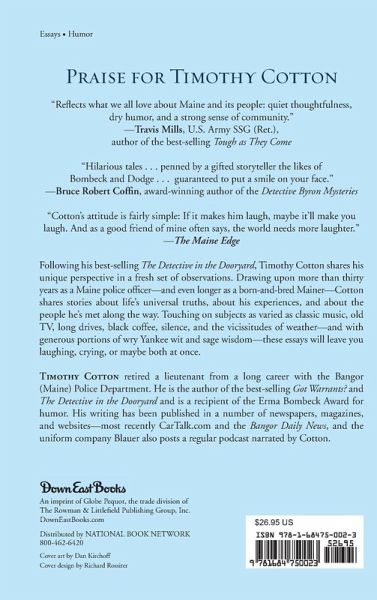 Tim Cotton is a lieutenant with the Bangor Police Department. Author of the bestselling The Detective in the Dooryard and Got Warrants? Cotton is a recipient of the Erma Bombeck Award for humor. His writing has been published in a number of newspapers, magazines, and websites—most recently CarTalk.com and the Bangor Daily News, andthe uniform company Blauer also posts a regular podcast narrated by Cotton. He lives in Bangor, Maine.