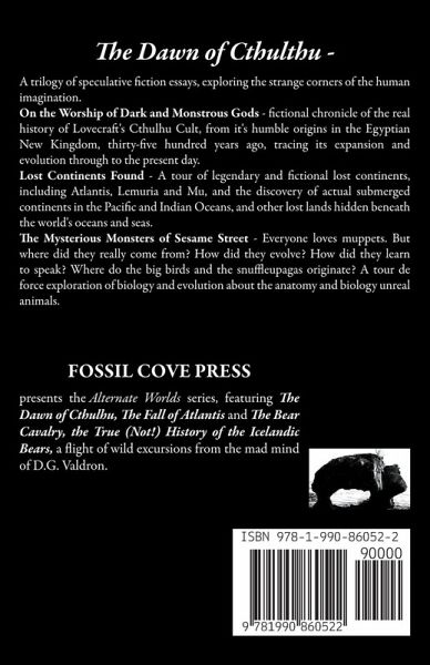 Dawn of Cthulthu - A trilogy of speculative fiction essays, exploring the strange corners of the human imagination, mixing genuine science, history and biology with fictional creations. On the Worship of Dark and Monstrous Gods - fictional chronicle of the real history of Lovecraft's Cthulhu Cult, from it's humble origins in the Egyptian New Kingdom, thirty-five hundred years ago, through its expansion into the Red Sea and along the African coasts, the emergence of Azathoth, Yog Sothoth and other Gods, conflicts with Buddhism and Islam. and domination of the Indian Ocean, and ultimately, to the present. Lost Continents Found - A tour of legendary and fictional lost continents, including Atlantis, Lemuria and Mu, and the discovery of actual submerged continents in the Pacific and Indian Oceans, and other lost lands hidden beneath the world's oceans and seas. The Mysterious Monsters of Sesame Street - Everyone loves muppets. But where did they really come from? How did they evolve? How did they learn to speak? Where do the big birds and the snuffleupagas originate? A tour de force exploration of biology and evolution about the anatomy and biology unreal animals.