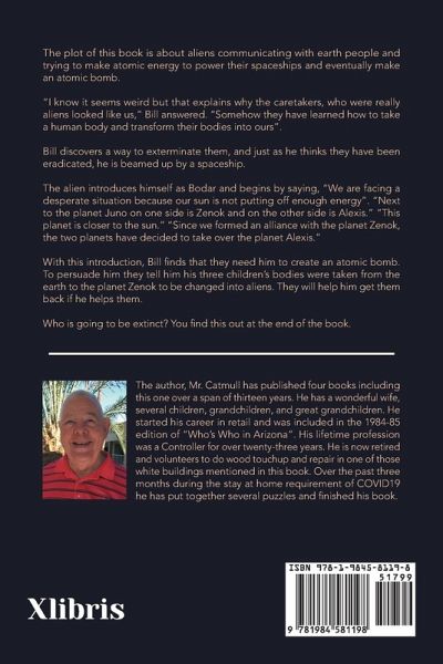 The plot of this book is about aliens communicating with earth people and trying to make atomic energy to power their spaceships and eventually make an atomic bomb. "I know it seems weird but that explains why the caretakers, who were really aliens looked like us," Bill answered. "Somehow they have learned how to take a human body and transform their bodies into ours". Bill discovers a way to exterminate them, and just as he thinks they have been eradicated, he is beamed up by a spaceship. The alien introduces himself as Bodar and begins by saying, "We are facing a desperate situation because our sun is not putting off enough energy". "Next to the planet Juno on one side is Zenok and on the other side is Alexis." "This planet is closer to the sun." "Since we formed an alliance with the planet Zenok, the two planets have decided to take over the planet Alexis." With this introduction, Bill finds that they need him to create an atomic bomb. To persuade him they tell him his three children's bodies were taken from the earth to the planet Zenok to be changed into aliens. They will help him get them back if he helps them. Who is going to be extinct? You find this out at the end of the book.