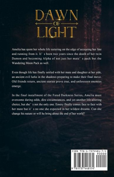 Amelia has spent her whole life teetering on the edge of accepting her fate and running from it. It's been two years since the death of her twin Damon and becoming Alpha of not just her mate's pack but the Wandering Moon Pack as well. Even though life has finally settled with her mate and daughter by her side, an ancient evil lurks in the shadows preparing to make their final move. Old friends return, ancient stories prove true, and unforeseen enemies emerge. In the final installment of the Fated Darkness Series, Amelia must overcome daring odds, dire circumstances, and yet another life-altering choice, but she's not the only one. Emery finally comes face to face with her mate but it's no one she ever expected in her wildest dreams. Can she change his nature or will he bring about the end of her world?