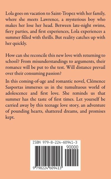 Lola goes on vacation to Saint-Tropez with her family, where she meets Lawrence, a mysterious boy who makes her lose her head. Between late-night swims, fiery parties, and first experiences, Lola experiences a summer filled with thrills. But reality catches up with her quickly. How can she reconcile this new love with returning to school? From misunderstandings to arguments, their romance will be put to the test. Will distance prevail over their consuming passion? In this coming-of-age and romantic novel, Clémence Sasportas immerses us in the tumultuous world of adolescence and first love. She reminds us that summer has the taste of first times. Let yourself be carried away by this teenage love story, an adventure of pounding hearts, shattered dreams, and promises kept. Because, at the end of the last page, you will know that love, no matter how complex and unpredictable it may be, always remains a journey cherished for eternity.
