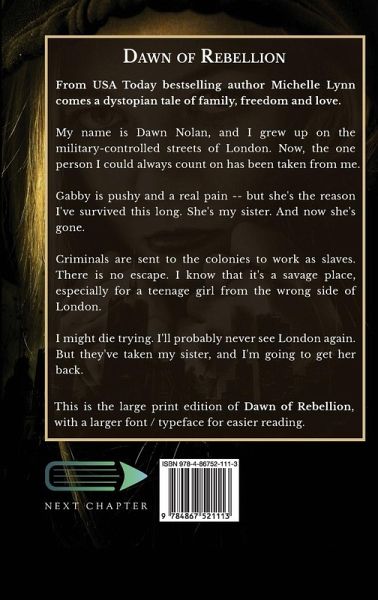 From USA Today bestselling author Michelle Lynn comes a dystopian tale of family, freedom and love. My name is Dawn Nolan, and I grew up on the military-controlled streets of London. Now, the one person I could always count on has been taken from me. Gabby is pushy and a real pain -- but she's the reason I've survived this long. She's my sister. And now she's gone. Criminals are sent to the colonies to work as slaves. There is no escape. I know that it's a savage place, especially for a teenage girl from the wrong side of London. I might die trying. I'll probably never see London again. But they've taken my sister, and I'm going to get her back. This is the large print edition of Dawn of Rebellion, with a larger font / typeface for easier reading.