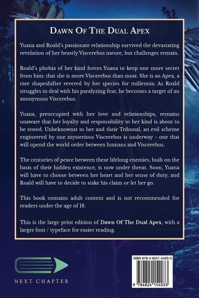 Yuana and Roald's passionate relationship survived the devastating revelation of her beastly Viscerebus nature, but challenges remain. Roald's phobia of her kind forces Yuana to keep one more secret from him: that she is more Viscerebus than most. She is an Apex, a rare shapeshifter revered by her species for millennia. As Roald struggles to deal with his paralyzing fear, he becomes a target of an anonymous Viscerebus. Yuana, preoccupied with her love and relationships, remains unaware that her loyalty and responsibility to her kind is about to be tested. Unbeknownst to her and their Tribunal, an evil scheme engineered by one mysterious Viscerebus is underway - one that will upend the world order between humans and Viscerebus. The centuries of peace between these lifelong enemies, built on the basis of their hidden existence, is now under threat. Soon, Yuana will have to choose between her heart and her sense of duty, and Roald will have to decide to stake his claim or let her go. This book contains adult content and is not recommended for readers under the age of 18. ¿¿¿This is the large print edition of Dawn Of The Dual Apex, with a larger font / typeface for easier reading.