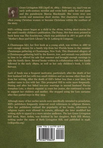 Grace Livingston Hill (April 16, 1865 – February 23, 1947) was an early 20th-century novelist and wrote both under her real name and the pseudonym Marcia Macdonald. She wrote over 100 novels and numerous short stories. Her characters were most often young Christian women or become Christians within the confines of the story. Hill's writing career began as a child in the 1870s, writing short stories for her aunt's weekly children's publication, The Pansy. Her first story printed in book form was The Esselstynes, which was published in 1877 as part of the "Mother's Boys and Girls Library" by D. Lothrop & Company. A Chautauqua Idyl, her first book as a young adult, was written in 1887 to earn enough money for a family trip from her Florida home to the summer Chautauqua gathering at Chautauqua, New York. This illustrated allegory of a Chautauqua gathering held by the flowers, tree, and animals was published in time to be offered for sale that summer and brought enough earnings to take the family there. Several books written in collaboration with her family followed in the early 1890s, as well as her only children's book, A Little Servant. Lack of funds was a frequent motivator, particularly after the death of her first husband left her with two small children and no income other than that from her writing. After the death of Hill's father less than a year later, her mother came to live with her. This prompted Hill to write more frequently. During and after her failed ten-year marriage to second husband Flavius Josephus Lutz, a church organist 15 years her junior, she continued to write to support her children and mother. She stopped using the Lutz surname after they parted ways in May 1914. Although many of her earlier novels were specifically intended to proselytize, Hill's publishers frequently removed overt references to religious themes. After her publishers realized the popularity of her books, references to religious topics were allowed to remain, although she later modified her writing style to appeal to a more secular audience. The last Grace Livingston Hill book, Mary Arden, was finished by her daughter, Ruth Hill Munce, writing under the name of Ruth Livingston Hill, and published in 1948. (wikipedia.org)