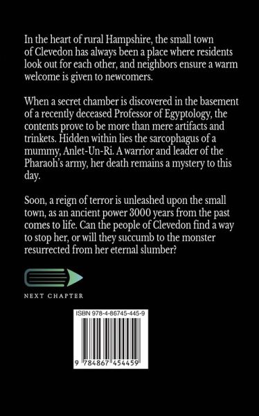 In the heart of rural Hampshire, the small town of Clevedon has always been a place where residents look out for each other, and neighbors ensure a warm welcome is given to newcomers. When a secret chamber is discovered in the basement of a recently deceased Professor of Egyptology, the contents prove to be more than mere artifacts and trinkets. Hidden within lies the sarcophagus of a mummy, Anlet-Un-Ri. A warrior and leader of the Pharaoh's army, her death remains a mystery to this day. Soon, a reign of terror is unleashed upon the small town, as an ancient power 3000 years from the past comes to life. Can the people of Clevedon find a way to stop her, or will they succumb to the monster resurrected from her eternal slumber?
